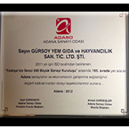 Gürsoy Yem 2011 yılı içerisinde gösterdiği başarı ile bir kez daha Türkiye'nin en büyük firmaları arasına girmeyi başardı. Adana Sanayi Odası (ADASO), Adana Ticaret Odası (ATO), Adana Ticaret Borsası (ATB) ve Adana Vergi Dairesi Başkanlığı (AVDB) işbirliğiyle düzenlenen törene, Gümrük ve Ticaret Bakanı Hayati Yazıcı, Kültür ve Turizm Bakanı Ömer Çelik, Türkiye Odalar ve Borsalar Birliği Başkanı Rifat Hisarcıklıoğlu, Adana Valisi Hüseyin Avni Coş, Adana Milletvekilleri Necati Çetinkaya, Ali Küçükaydın, Fatoş Gürkan, Ümit Özgümüş, Ali Demirçalı ve Turgay Develi, Adana Büyükşehir Belediye Başkan Vekili Zihni Aldırmaz ile davetliler katıldı. Törende firmamıza verilen ödülü şirketimiz adına Yönetim Kurulu Başkan Yardımcısı Günkut Gürsoy aldı.